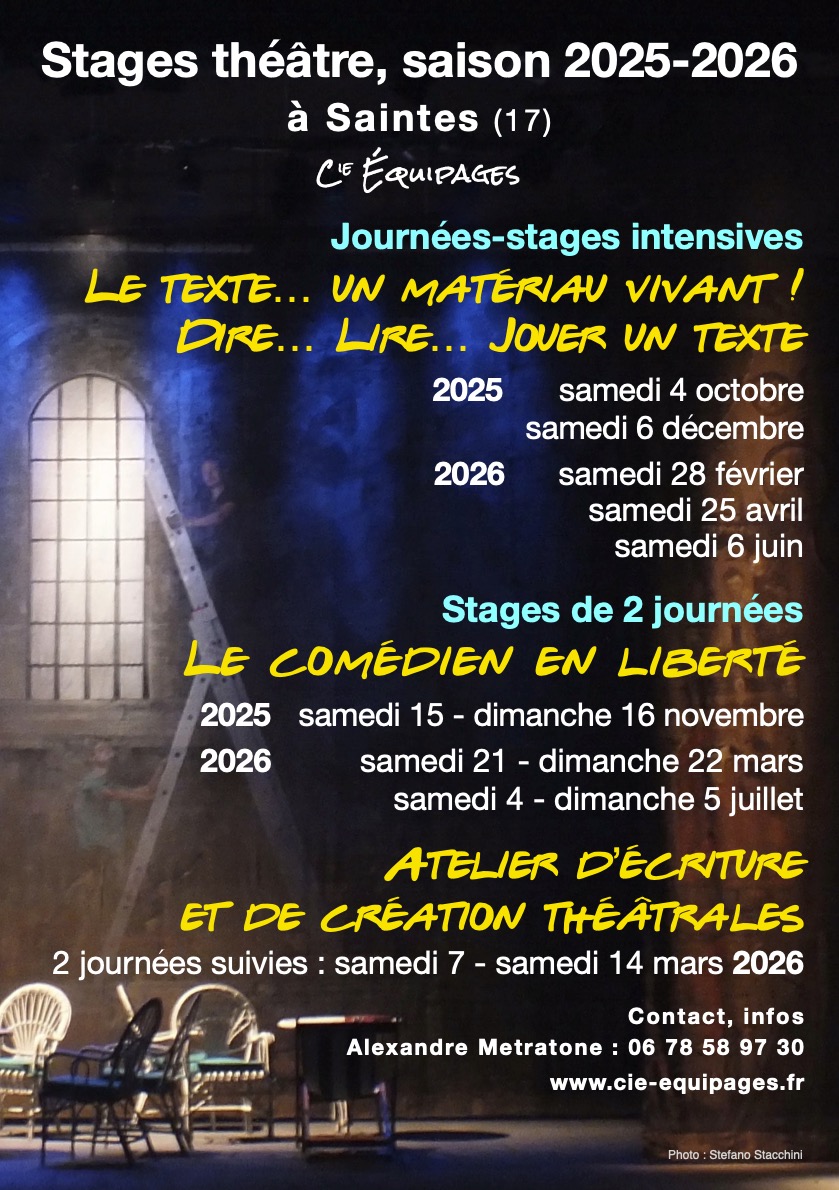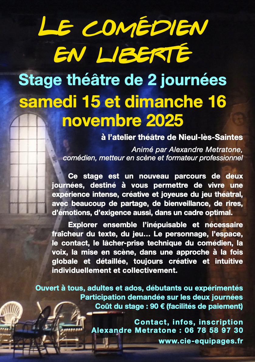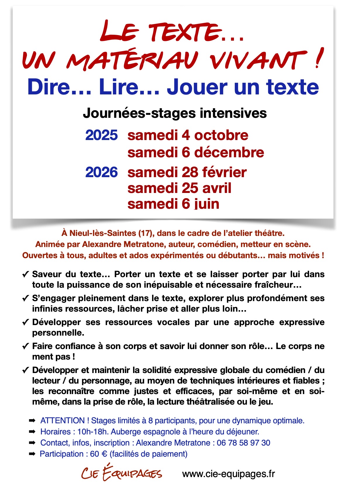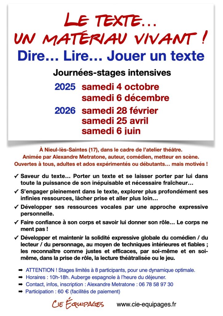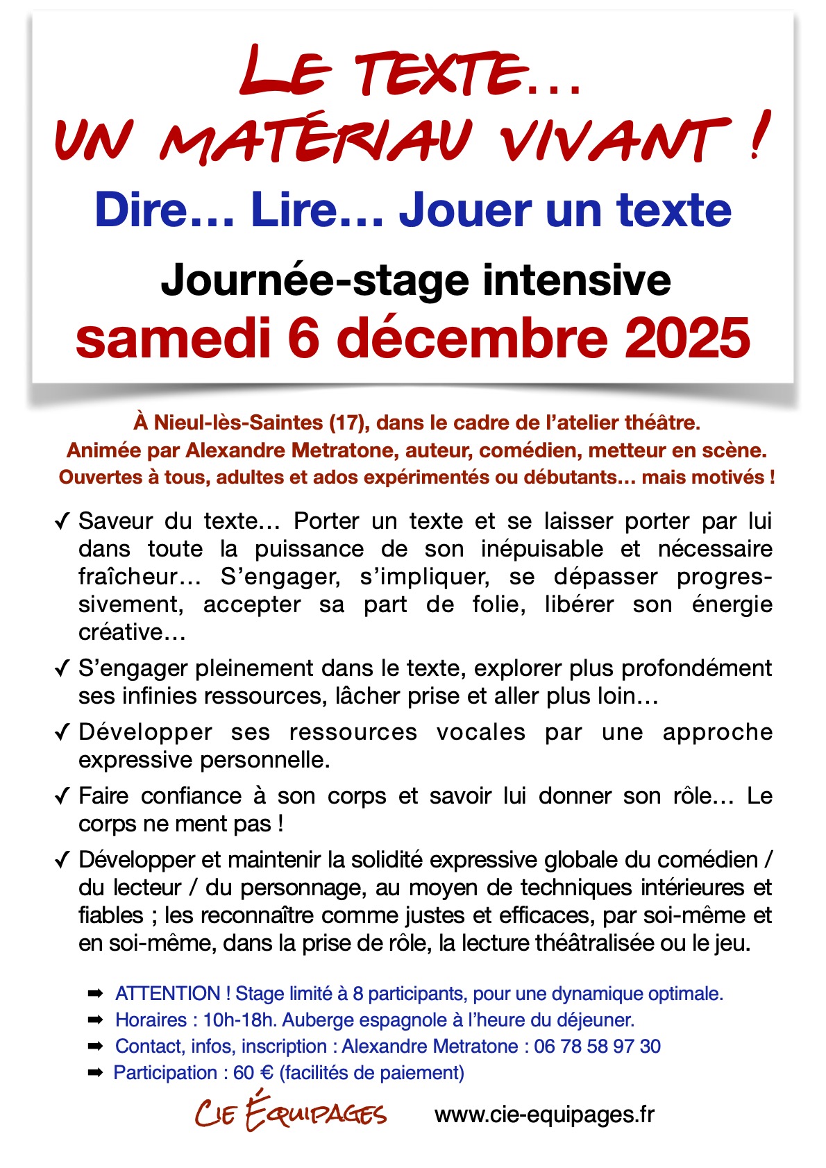 Asnières-la-Giraud, à quelques km de Saint-Jean d’Angély (17400) : maison particulière, les samedis 13 et 20 novembre : Atelier suivi d’écriture et de création théâtrales avec Alexandre Metratone, de 10h à 17h, avec auberge espagnole à l’heure du déjeuner.